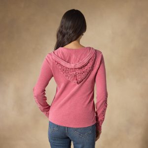 What do you get when you cross your favorite layering henley with your go-to lightweight hoodie? Introducing Caitlin. the most marvelous multi-tasker of the season—with tonal crochet details on the hood and sleeves. flattering seaming. a modern raw-edged placket and delicate henley buttons on an open V-neck. Cotton. Machine wash. Imported. Sizes XS (0–2). S (4–6). M (8–10). L (12–14). XL (16–18). XXL (20–22). Approx. 25l.