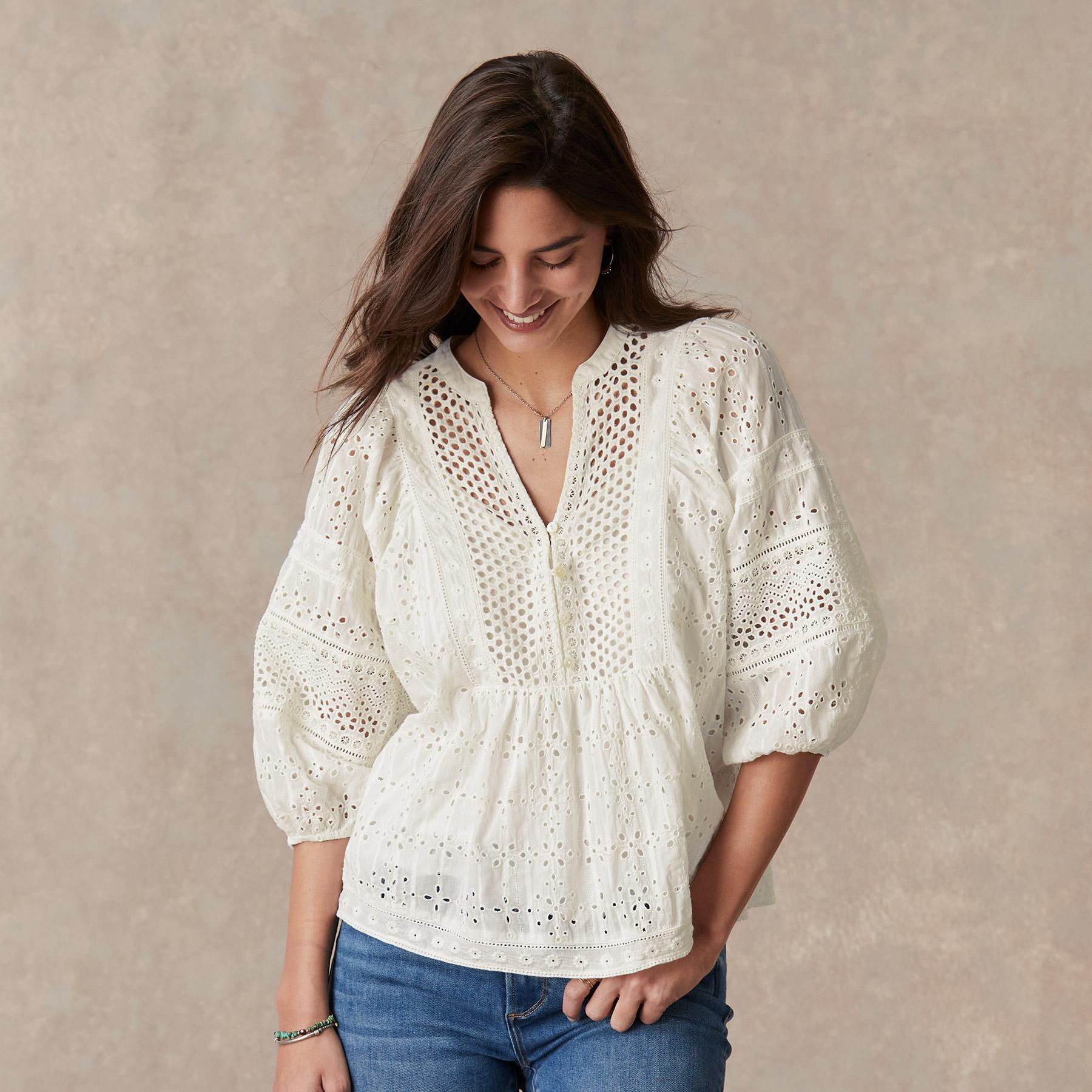 Tonal eyelet embroidery brings life to our relaxed top boasting bold. voluminous sleeves with elastic cuffs. ladder lace insets and shell buttons at the henley placket. Camisole included. Cotton. Machine wash. Imported. Exclusive. Sizes XS (0–2). S (4–6). M (8–10). L (12–14). XL (16–18). XXL (20–22) Approx. 25.5l.