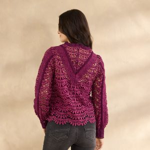 Luxurious allover lace adds elegance to every step of our detailed crocheted top with bold sleeves. scalloped bottom and so much texture. Invisible button closure at the back. Camisole included. Polyester/cotton/modal. Hand wash. Imported. Exclusive. Sizes XS (0–2). S (4–6). M (8–10). L (12–14). XL (16–18). XXL (20–22). Approx. 23.5l.