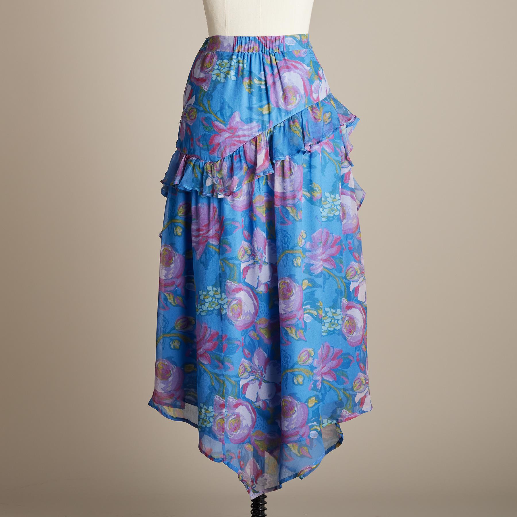 Beautiful. high-waisted skirt in a watercolor-inspired print with asymmetrical ruffle detail. front slit. side zip. elastic back waist. Fully lined. Cupro. Hand wash. Imported. Exclusive. Sizes XXS (00). XS (0 to 2). S (4 to 6). M (8 to 10). L (12 to 14). XL (16 to 18). Approx. 34-3/4L.