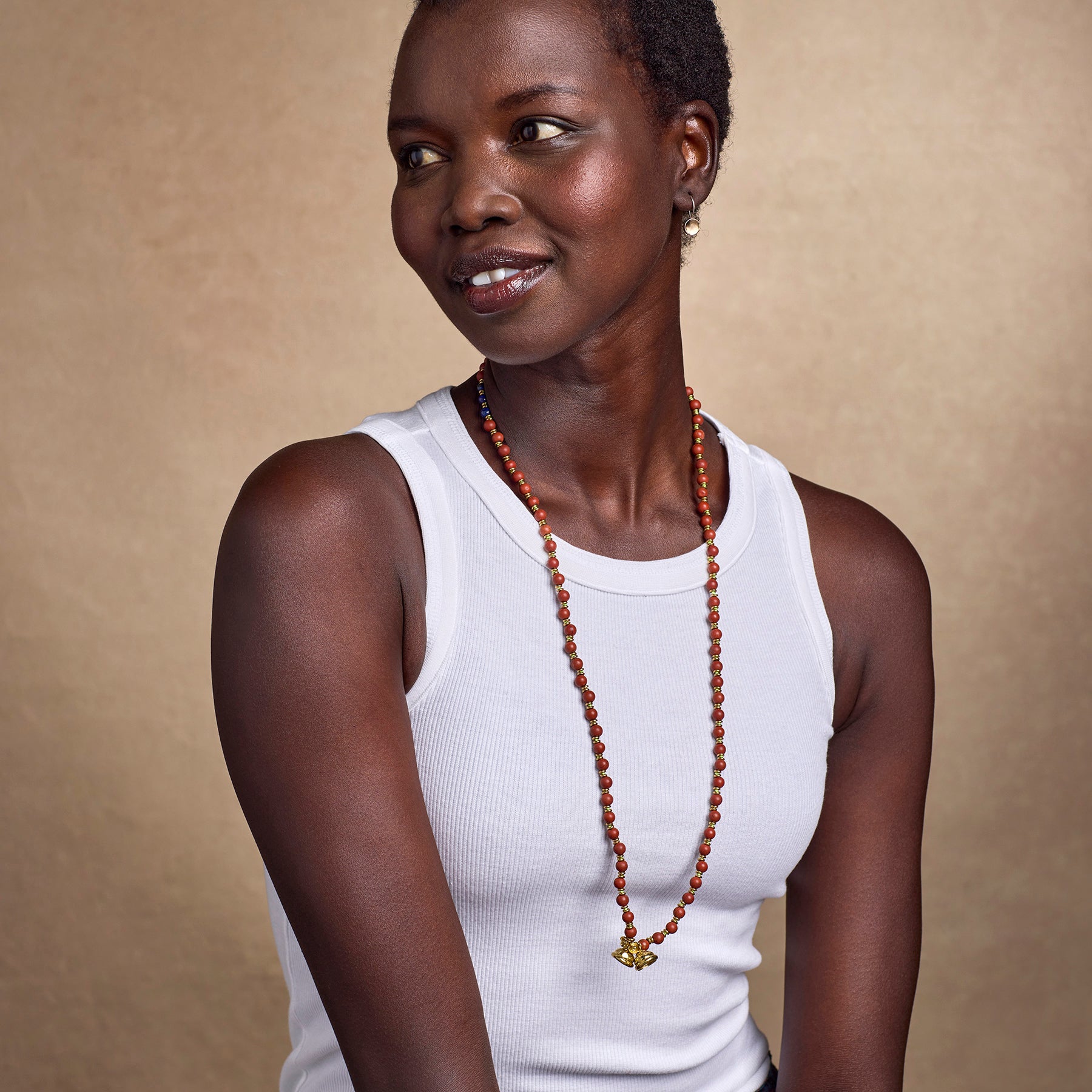 Long enough to slip over your head. this hand-knotted gemstone necklace is easy to wear and ready for adventure. Red jasper and lapis beads; brass spacers. bells and blossoms. Imported. 32l.