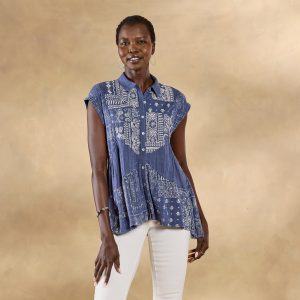 Thanks to its alluring print and lovely geometric embroidery. this mixed-media top can be dressed up or down. With button front. collar and a flattering A-line silhouette. Cotton/modal. Machine wash. Imported. Exclusive. Sizes XS (0–2). S (4–6). M (8–10). L (12–14). XL (16–18). XXL (20–22). Approx. 24l.