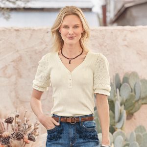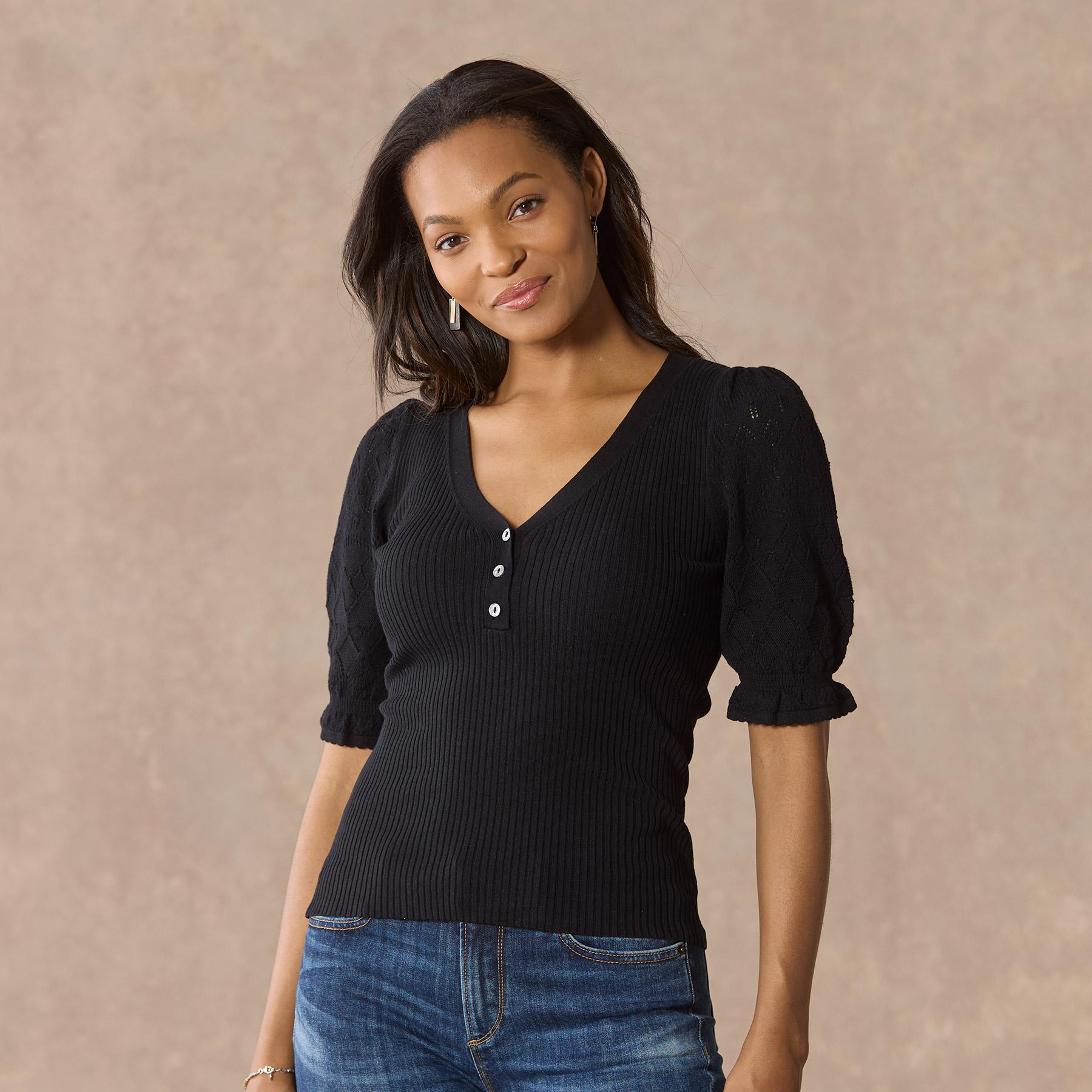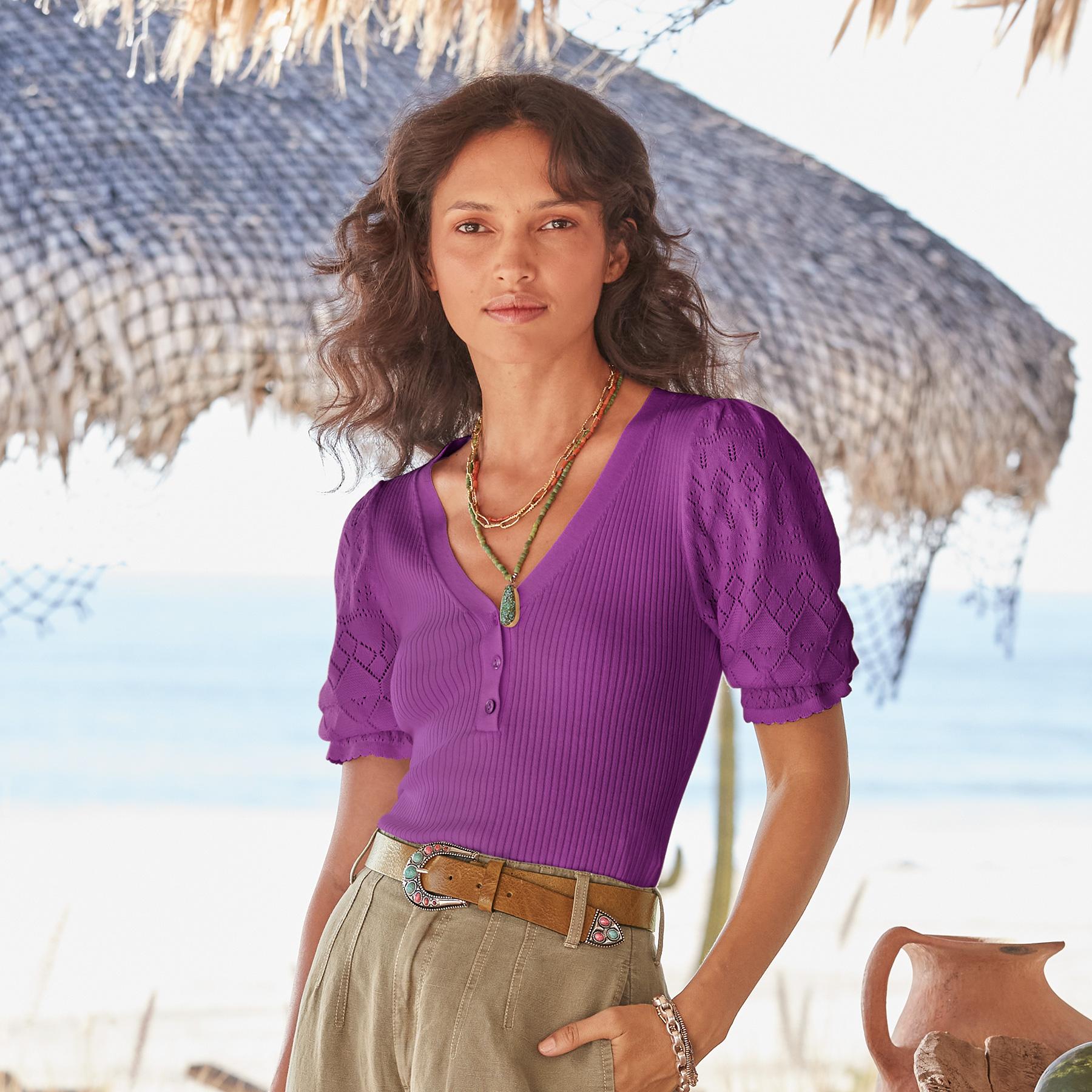 Experience the essence of luxury in our feminine and fitted V-neck henley. so soft in our Legends Lightweight Yarn. Beautiful pointelle at the bold puff sleeves and special scalloped trim details add an extra touch of grace. Organic cotton/nylon/spandex. Machine wash. Imported. Exclusive. Sizes XXS (00). XS (0–2). S (4–6). M (8–10). L (12–14). XL (16–18). Approx. 20.5l.
