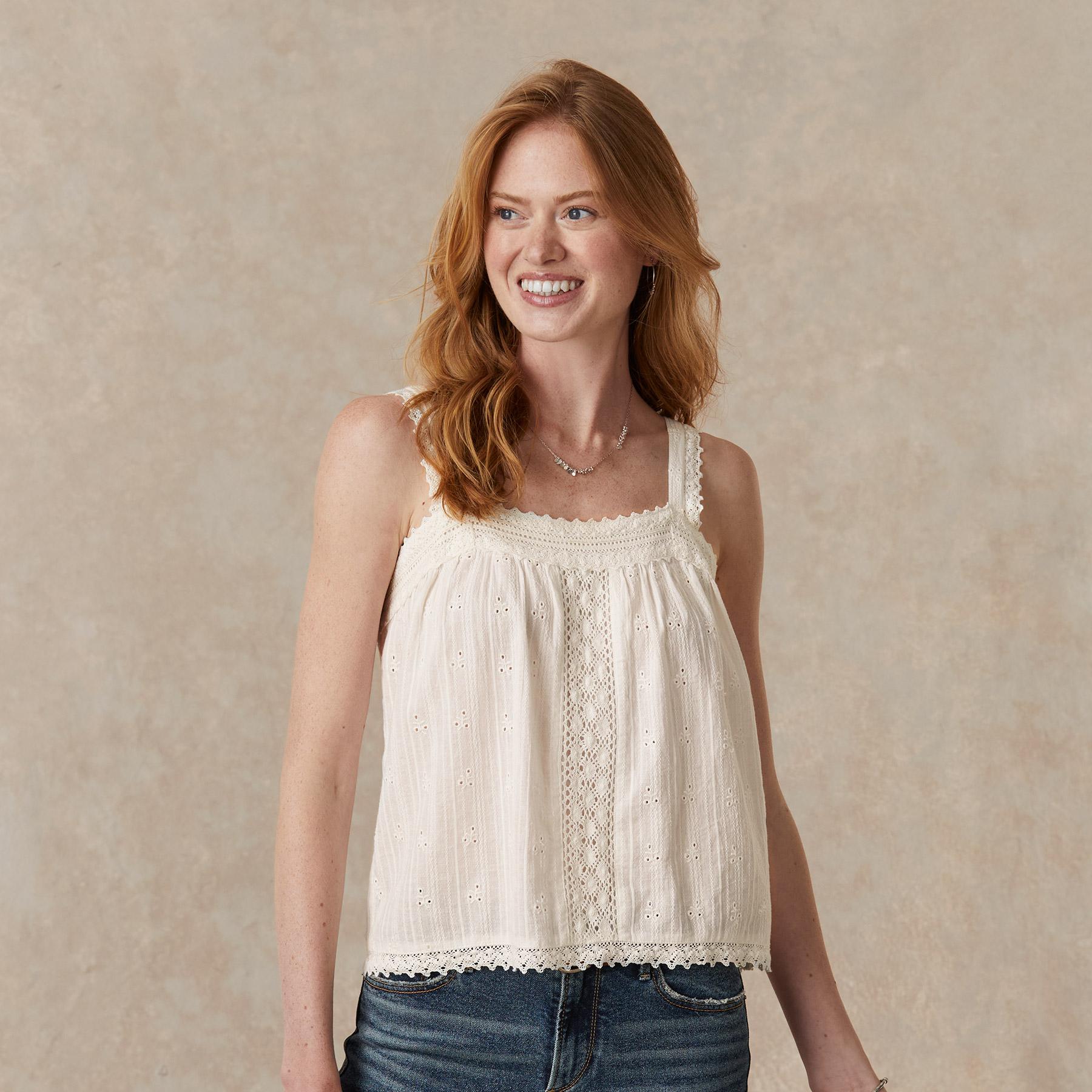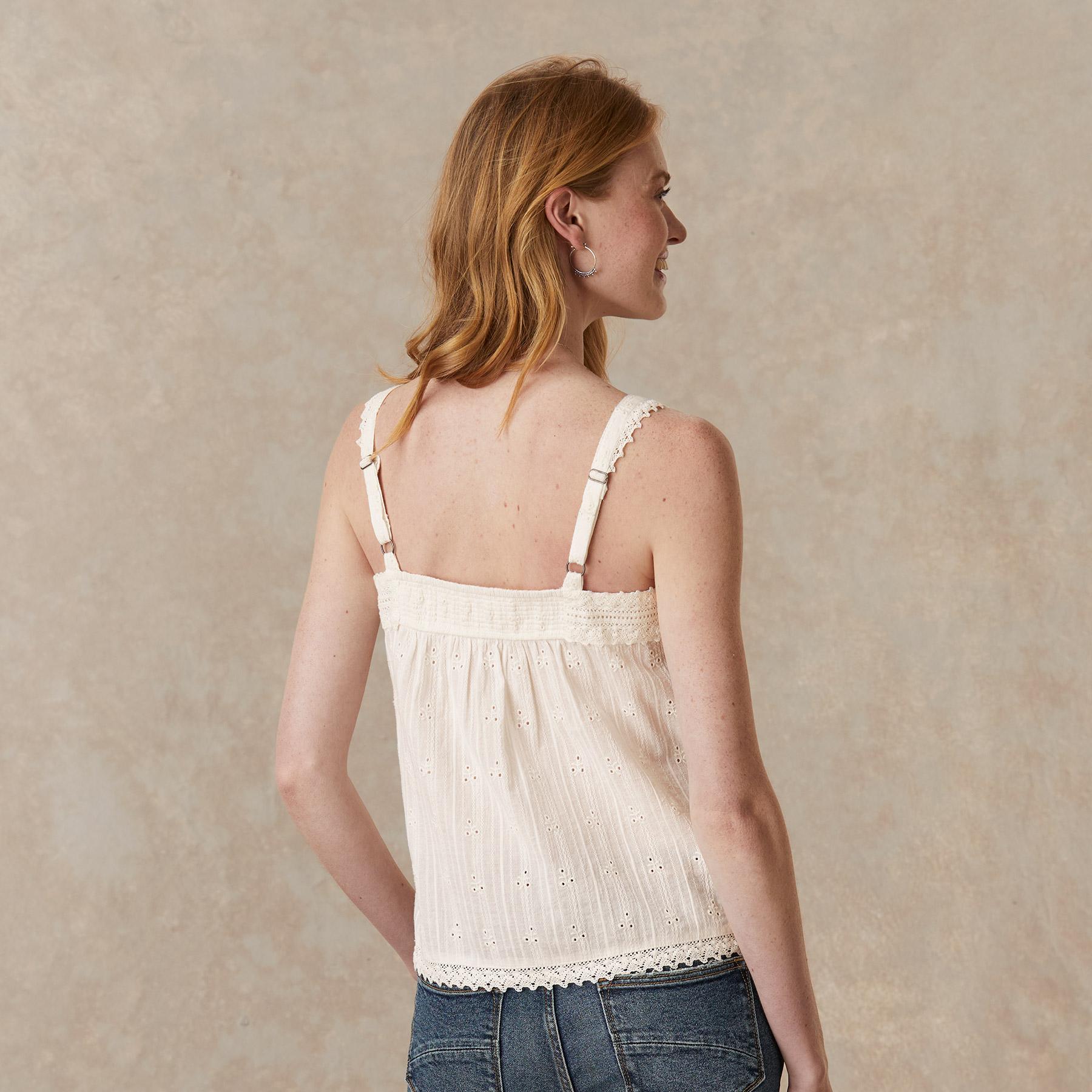 Vintage-inspired. oh-so-feminine camisole with beautiful tonal embroidery and lace details at neckline and front. Adjustable straps and elastic at back neck for comfortable fit. Cotton/viscose. Machine wash. Imported. Exclusive. Sizes XS (0–2). S (4–6). M (8–10). L (12–14). XL (16–18). XXL (20–22). Approx. 25l.
